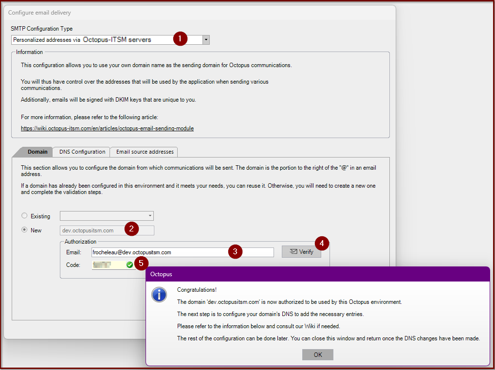 - Select Personalized Addresses via Octopus-ITSM Servers in the SMTP Configuration Type field
