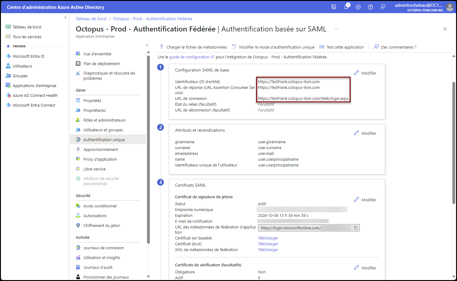 Afin que les deux systèmes (Octopus & Microsoft Entra ID) puissent identifier, de façon unique, un utilisateur, il doit exister une clé unique connue entre ces deux systèmes. Octopus utilise le UPN (User Principal Name) de l'utilisateur pour identifier les utilisateurs qui vont se connecter. Le UPN d'un utilisateur prend la forme d'une adresse courriel : nomutilisateur@domaine.com. Dans la majorité des cas, le UPN correspond à l'adresse courriel de l'utilisateur.