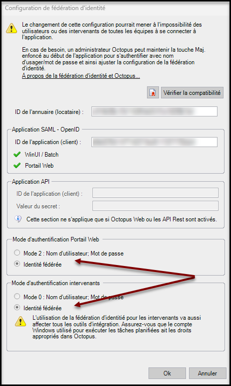 - Pour que vos techniciens (utilisant l'application Windows) et les outils Batchs (MailIntegration, ADSIReader, DataImporter, etc...) s'authentifient automatiquement, sélectionner "Identité fédérée"