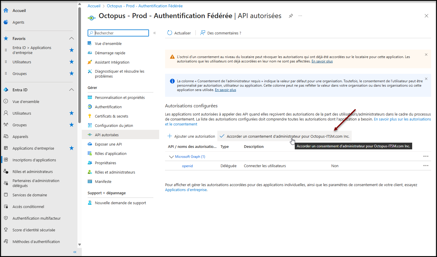 - Cliquer sur Accorder un consentement d'administrateur pour [Votre nom de locataire Entra ID]