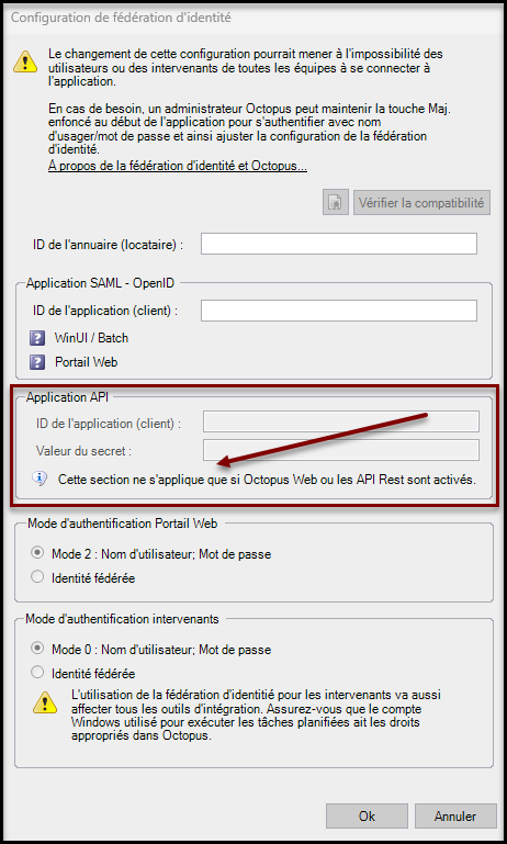 Vérifier que le message suivant s'affiche : "Cette section ne s'applique que si Octopus Web ou les API Rest sont activés"