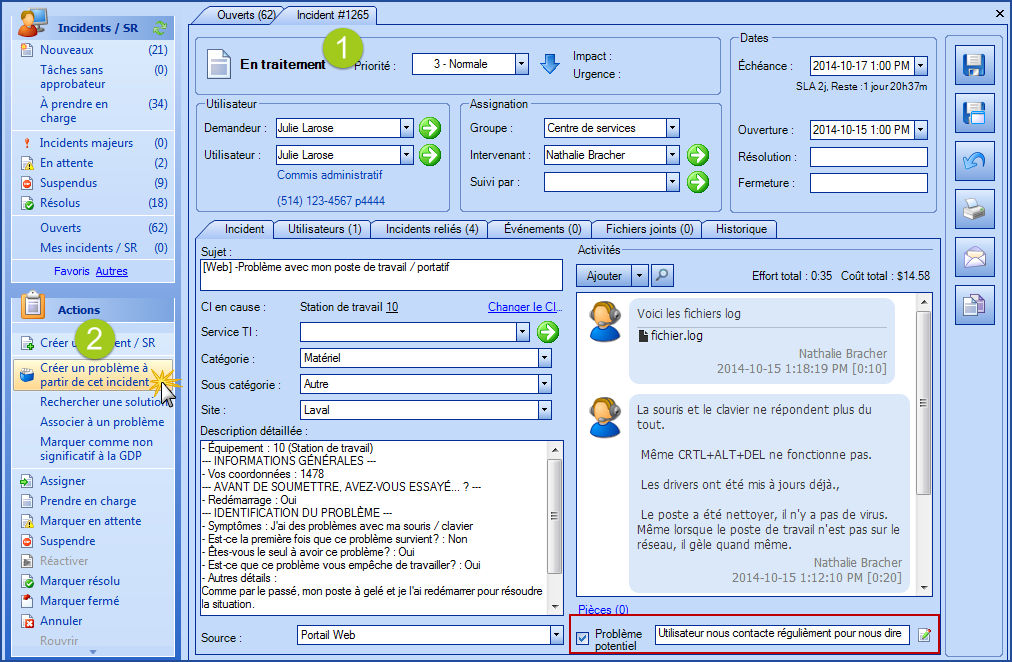 - L'utilisation, lorsqu'approprié, de la case Problème potentiel pour un incident pouvant représenter un problème potentiel