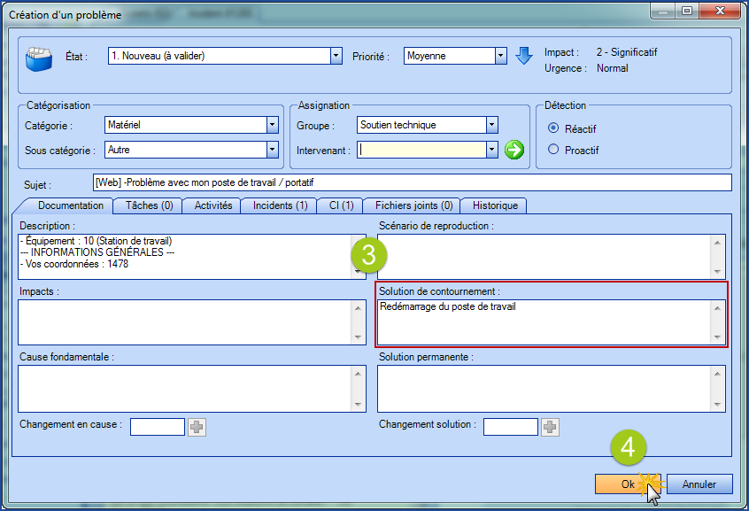 - Enregistrer le problème en cliquant OK. Un numéro de référence unique est automatiquement attribué par le système