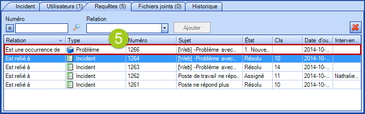 - Si une requête de type Problème a été reliée à cet Incident avec le type Est une occurrence de.